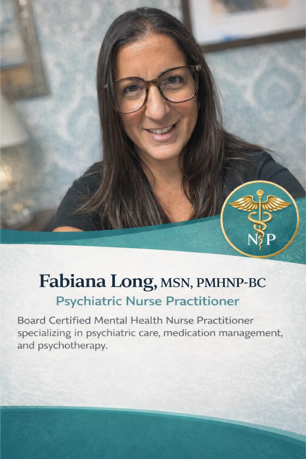 Hey, I'm Fabiana!Fabiana is a board-certified Psychiatric Mental Health Nurse Practitioner (PMHNP-BC) providing psychiatric evaluation, diagnosis, and medication management for teens and adults. She brings over 21 years of nursing experience, including work in acute care and emergency psychiatry.